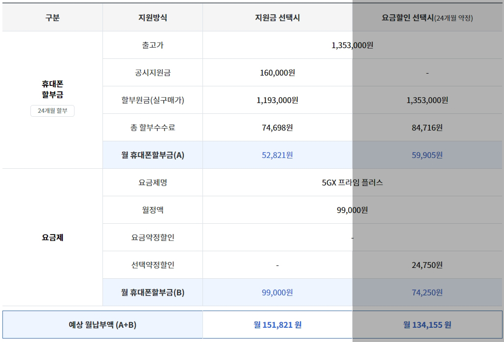 24개월 약정을 기준으로 하며, 부가세 포함 금액입니다.