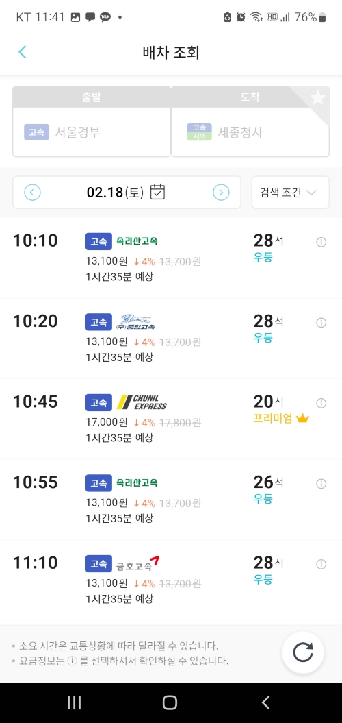 도착하는 까지 소요시간, 좌석수...