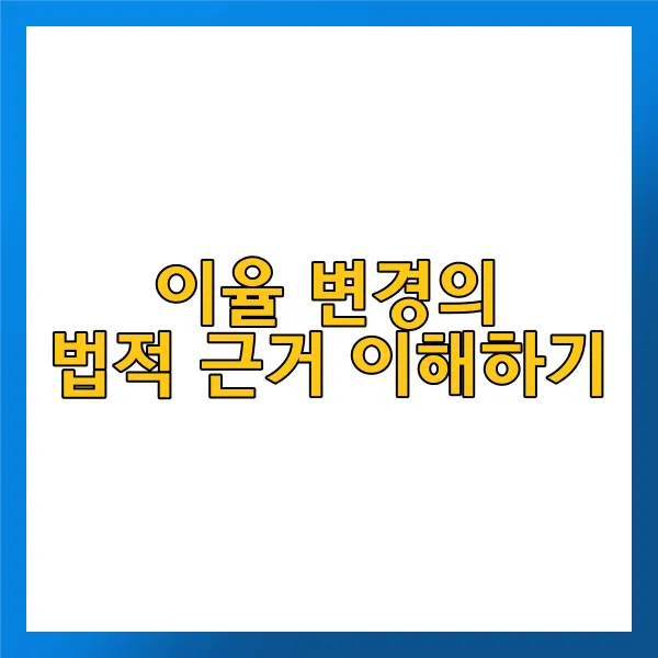 법적 근거를 명확히 이해하기 위해서는 계약서의 내용을 면밀히 검토하고, 각 조항의 의미를 파악하는 것이 중요합니다. 만약 이율 변경이 불법적이라고 판단된다면, 즉시 법적 조치를 취하는 것이 필요합니다. 계약서에는 보통 이율 변경의 통지 방법과 기간이 기재되어 있으므로, 이를 통해 변경의 정당성을 따져볼 수 있습니다. 📑