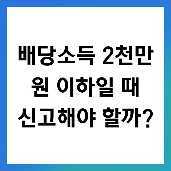 배당소득 2천만 원 이하의 경우, 신고 의무가 없더라도 정확한 이해와 준비가 필요합니다. 배당소득 기본공제 와 관련 법규를 충분히 이해하고, 신고 대상 여부를 명확히 확인 하는 것이 중요합니다. 또한 신고 절차와 필요한 서류 를 사전에 준비하여 불필요한 낭패를 피해야 합니다. 주의할 점을 꼼꼼히 살펴 미비한 점이 없도록 하고, 전문가의 조언을 받는 것 도 현명한 선택입니다. 정확한 정보와 준비는 최선의 결과를 가져옵니다.