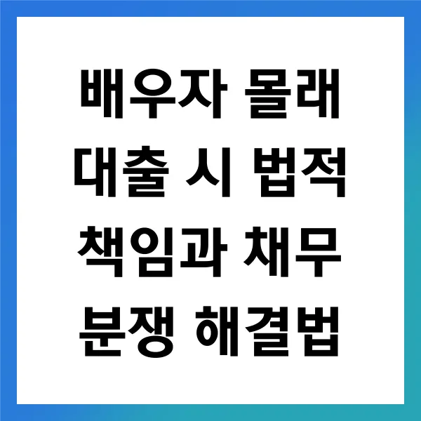 배우자 몰래 대출을 받는 상황은 법적, 개인적 갈등을 유발 할 가능성이 큽니다. 사전에 법적 요건을 철저히 검토 하고 필요한 서류와 절차를 통해 채무 분쟁을 대비 하는 것이 중요합니다. 또한, 배우자 간의 문제를 원만히 해결하기 위해서는 조정과 대화가 필수적 입니다. 문제 발생 시에는 법률 전문가의 상담 을 받아 더 나은 해결책을 찾는 것이 필요합니다. 이 모든 과정은 신중한 준비와 상호간의 이해 를 통해 불필요한 갈등을 피하는 데 기여할 것입니다. 이러한 노력이 더 나은 금융적 미래를 보장 할 것입니다.