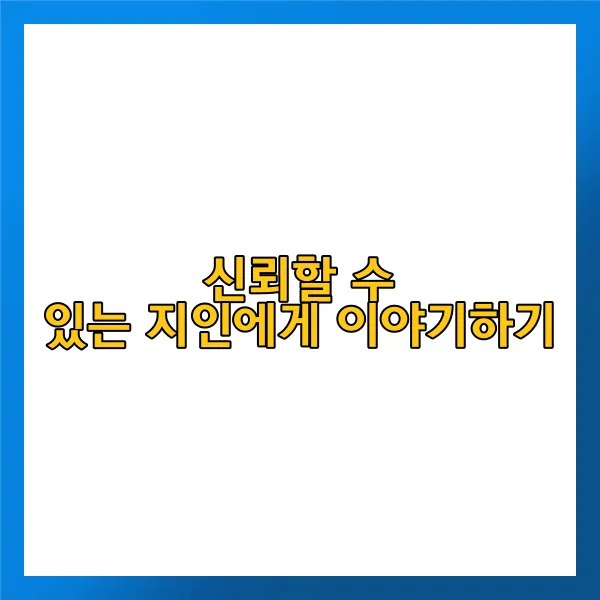 신뢰할 수 있는 지인과의 대화는 매우 중요한 첫 걸음이 됩니다. 평소 믿고 의지해온 친구, 가족, 또는 동료에게 이야기를 나누는 것은 두 가지 주요 효과를 가지고 있습니다. 첫째, 자기 감정을 나누는 과정에서 정신적인 안정감을 찾을 수 있으며, 둘째, 지인의 조언이나 지원을 통해 문제를 보다 객관적으로 바라볼 수 있습니다. 불안과 스트레스가 심해질수록 이러한 지지를 필요로 하게 됩니다.