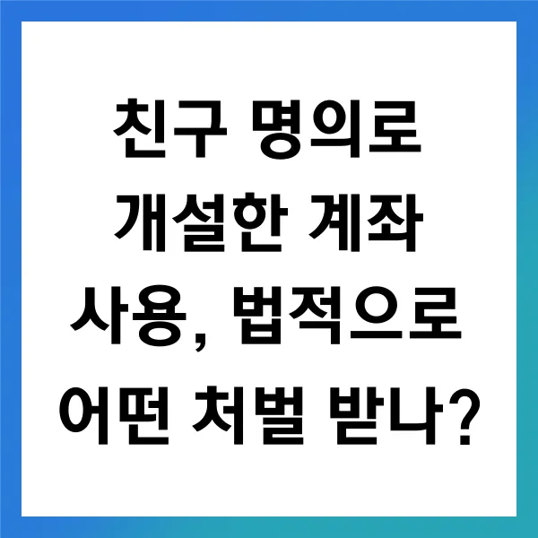 또한, 친구 명의로 계좌를 개설할 경우, 그 계좌에서 발생하는 모든 거래는 친구의 책임 하에 놓이게 됩니다. 만약 그 계좌가 범죄에 악용되거나, 금융사기와 관련된 거래가 이루어진다면, 해당 친구는 법적으로 중대한 책임을 질 수 있습니다. 명의 도용으로 간주될 경우, 이는 형법 제347조에 따라 처벌받을 수 있으며 , 최대 5년 이하의 징역형 또는 1천만 원 이하의 벌금에 처해질 수 있습니다.