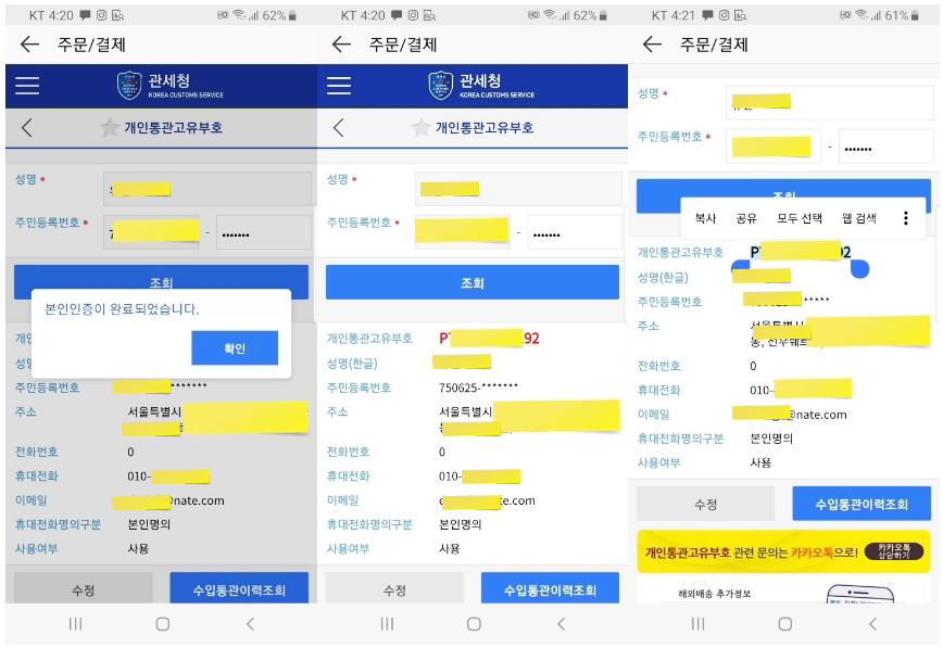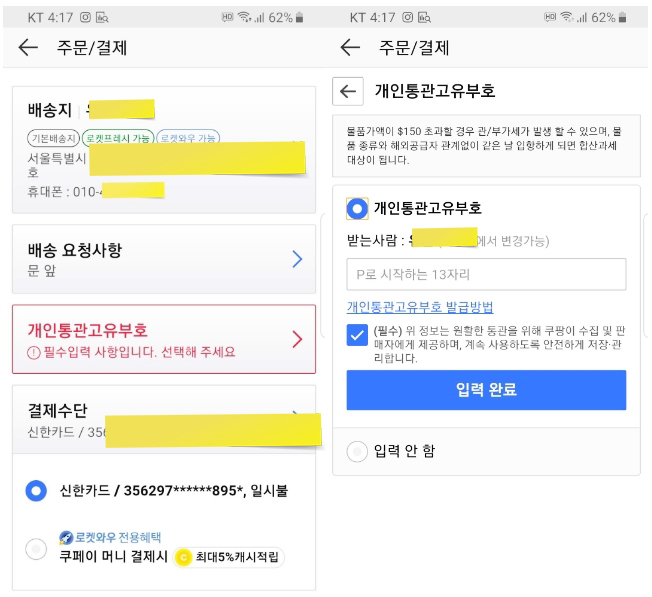 어쩔 수 없이 개인통관부호 확인해야 합니다.