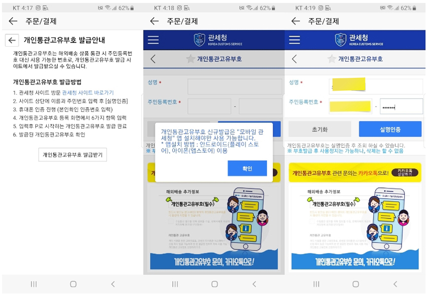 "개인통관고유부호발급"은 간단한 본인인증 후 이용 가능 합니다.