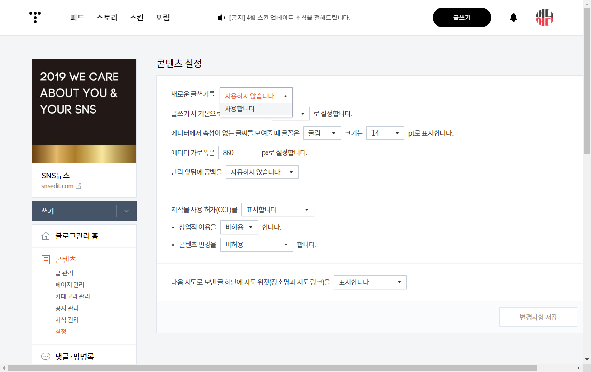 왼쪽에 '콘텐츠'라는 카타고리가 있습니다.