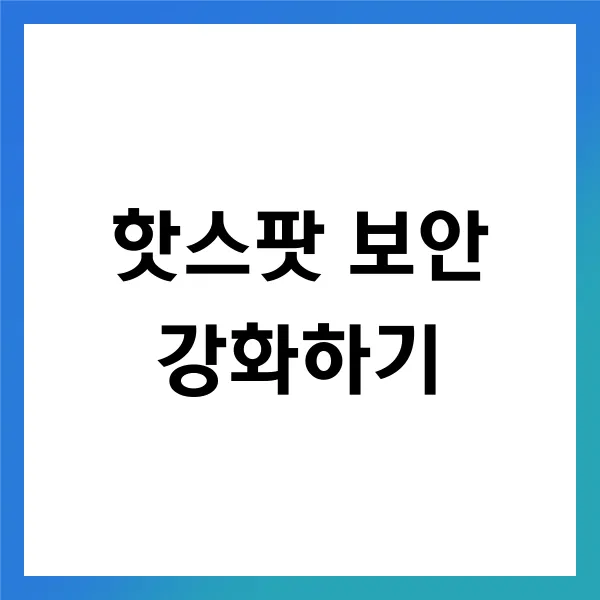 이후 보안 설정을 강화하는 것이 중요합니다. 핫스팟은 일반적으로 WPA2-PSK 암호화를 지원합니다. 암호화 방법을 선택하고 안전한 비밀번호를 설정하는 것이 좋습니다. 비밀번호는 최소 8자리 이상으로 설정하는 것이 이상적이며, 대문자, 소문자, 숫자 및 특수 문자를 포함하면 더욱 안전합니다. 예를 들어, “MyS3cureP@ssw0rd!”와 같은 조합이 좋습니다. 이렇게 하면 Unauthorized Access 를 방지할 수 있습니다.