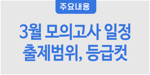 3월 모의고사 범위는 고2번위 입니다. 교육청 모의고사는 자신이 자만의 길이냐 노력의 길이냐를 자신에게 물을 수 있는 경험이 됩니다. 따라서, 잘 준비해서 6월 한국교육과정평가원 모의고사와 수능까지 성적이 잘 나올 수 있도록 합시다. 결론, 3월 모의고사를 무시하면 절대 안됩니다.