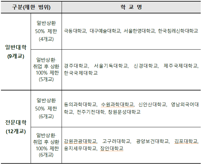 ※ 고등교육법 제2조 제1호, 제2호, 제4호에 따른 일반대학, 산업대학, 전문대학 중 정부 재정지원이 가능한 대학
