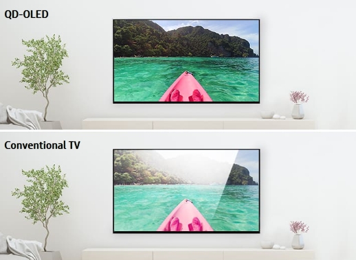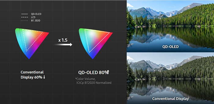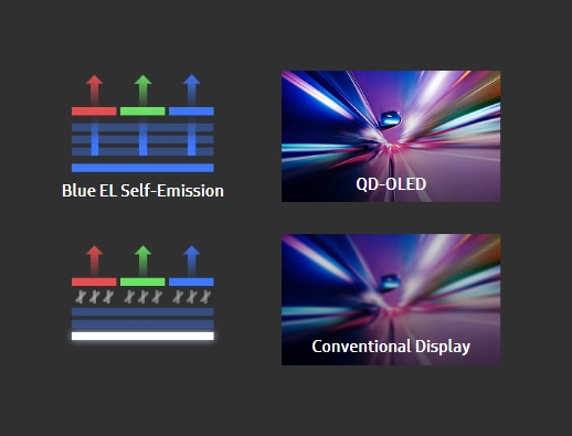 QD-OLED 기술을 통해 시청자와 청중은 이제 더 밝고 풍부한 밝기 수준으로 생생한 색상과 높은 명암비를 경험할 수 있습니다. 이 기술은 더 밝고 밝은 영역과 더 어두운 어두운 영역을 통해 이미지에 생명을 불어넣어 보기 경험을 더 깊게 합니다. 이는 특정 파장의 자체 전자기파를 방출하도록 배열된 QD(Quantum Dot) 나노입자를 통해 달성되어 기존 OLED보다 훨씬 더 채도가 높은 이미지를 생성합니다. 어두운 부분이 깊어져 높은 명암비를 유지하면서도 기존 LCD에 가까운 생생한 색상을 제공한다.