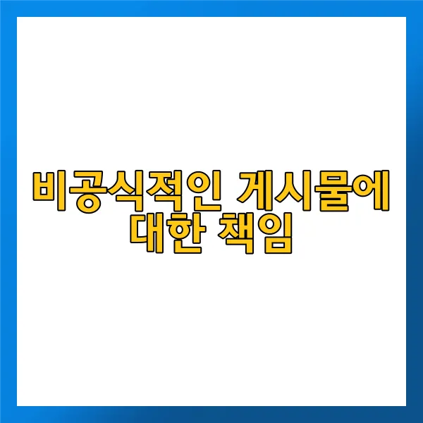 셋째로, 법적 규제와 관련된 사항들입니다. 한국의 정보통신망법 및 개인정보 보호법은 사용자가 게시하는 내용에 대해 명확한 책임을 지도록 규정하고 있습니다. 비공식 계정의 소유자가 특정 게시물로 인해 발생한 법적 문제에 관해 책임을 져야 할지 여부는 이 법률에서 다루는 규정에 크게 의존합니다. 이는 비공식 계정이라고 하더라도 직접적으로 법적 책임을 면할 수 없음을 의미합니다. 따라서, 사용자들은 자신의 게시물이 법률에 어떻게 적용될 수 있는지를 충분히 숙지하고 행동해야 합니다.